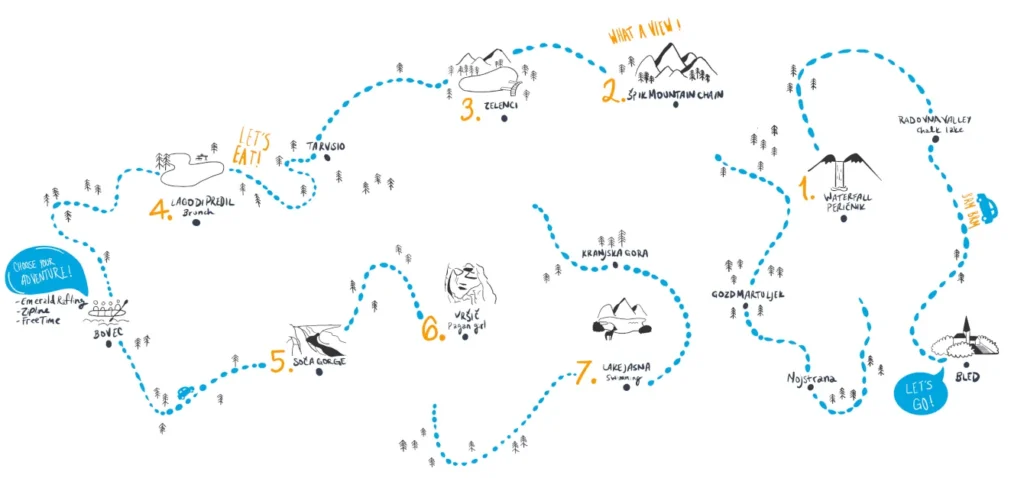 Po vrnitvi v Slovenijo pot poteka skozi Bovec s postankom v Veliki soteski Soče, nato pa sledi kratek sprehod do slapa Virje. Od tam se cesta vzpenja čez prelaz Vršič, najvišji asfaltirani gorski prelaz v Sloveniji, preden se spusti do jezera Jasna v Kranjski Gori.